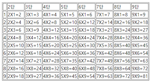 예제 ) 자바스크립트 반복문을 사용하여 구구단을 출력하시오.