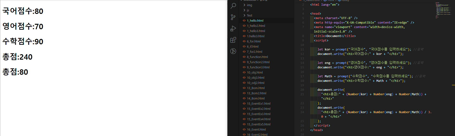 예제 ) 자바 스크립트로 국영수 점수를 입력 받아 , 총점과 평균을 디스플레이 하시오.